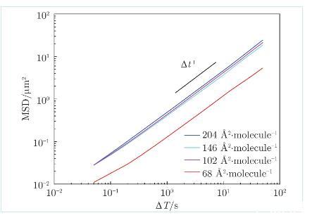 在LE相表面均勻的膜上,均方位移MSD隨時間間隔Δt線性增長(圖4),阻力系數(shù)由愛因斯坦關(guān)系