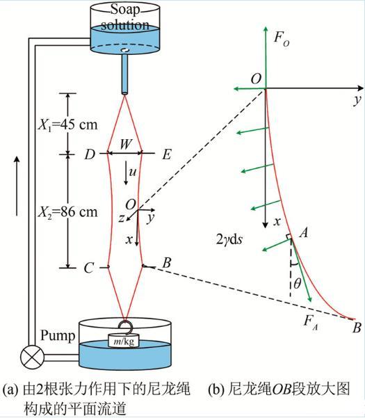 如圖1(a)所示,配制的皂液盛于上水箱中,經一個狹長的出水管流出,進入一個由兩根直徑為0.32 mm的尼龍繩構成的豎直平面流道(實驗中,尼龍繩一直處于下方砝碼施加的張力作用下)。緊接出水管口的流道為漸擴的擴張段,其下為流道寬度不變的實驗段和流道逐漸收窄的收縮段(在本文實驗中,擴張段長度X1=45 cm;實驗段長度X2=86 cm,實驗段入口寬度W=5 cm)。在擴張段,皂液在重力驅動下加速,當重力和空氣阻力平衡時充分發展,最終在實驗段達到勻速運動,之后經收縮段流入下水箱,再被泵回至上水箱,形成往復循環。