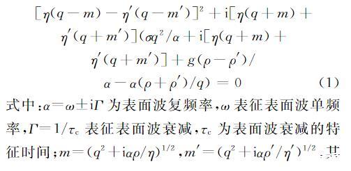 式中:α=ω±iΓ為表面波復(fù)頻率,ω表征表面波單頻率,Γ=1/τc表征表面波衰減,τc為表面波衰減的特征時間;m=(q2+iαρ/η)1/2,m′=(q2+iαρ′/η′)1/2,其中未知參數(shù)q、η、η′、ρ、ρ′分別為表面波波數(shù)、液相黏度、氣相黏度、液相密度、氣相密度;σ為表面張力。