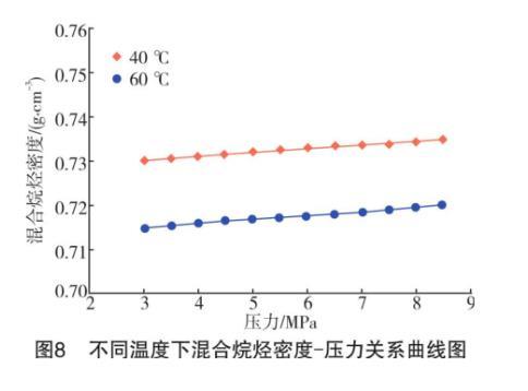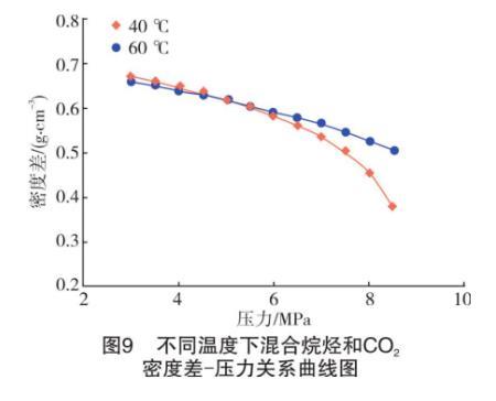 從混合烷烴密度-壓力曲線(見(jiàn)圖8)來(lái)看,整個(gè)測(cè)試壓力區(qū)間內(nèi)溫度對(duì)混合烷烴的密度影響不大,因此液體密度也不會(huì)造成界面張力的較大變化。從CO2密度-壓力曲線(見(jiàn)圖7)來(lái)看,溫度在中高壓下對(duì)CO2密度的影響較大。尤其是在3.5 MPa之后,60℃下的氣體密度隨著壓力升高速率明顯高于40℃時(shí)的速率。在同一壓力下,氣體密度隨著溫度升高顯著降低。密度較低的CO2氣體分子分布越稀疏,與烷烴液面直接接觸的氣體分子越少,故降低了二者發(fā)生萃取和混溶的概率,間接地導(dǎo)致液體的界面張力值增加。