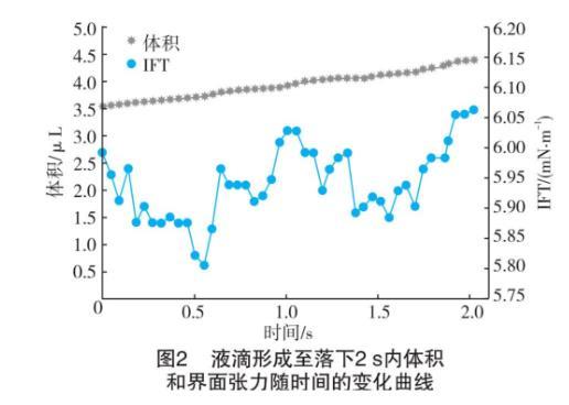 圖2為40℃、6.5 MPa時(shí),液滴形成至落下的2 s內(nèi)液滴體積和測(cè)得的界面張力隨時(shí)間的變化。由圖2可看出,在落下過(guò)程中體積逐漸變大,界面張力誤差在0.3 mN/m之內(nèi),雖然浮動(dòng)不是很大,但任取一點(diǎn)不能較好地體現(xiàn)整體。因此,選擇在懸滴完全形成開始計(jì)算,到完全落下以幀為間隔,因?yàn)橐旱瓮耆纬蓵r(shí)可以較清晰地得到液滴的最大曲率半徑,批量計(jì)算這段時(shí)間內(nèi)的界面張力值,最后得到其平均值。為避免液滴的隨機(jī)性,在每種環(huán)境下選取3個(gè)連續(xù)滴落的液滴的平均界面張力值作為最終結(jié)果。減少了實(shí)驗(yàn)的偶然性,使得到的結(jié)果更加可信。