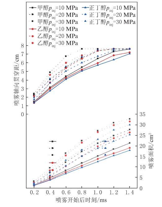 圖2為3種醇類燃料在背壓0.1 MPa、環(huán)境溫度20℃時(shí),不同噴射壓力下噴霧開始后時(shí)刻0.2至1.4 ms內(nèi)的噴霧軸向貫穿距和噴霧面積的變化,其中pinj定義為噴射壓力。