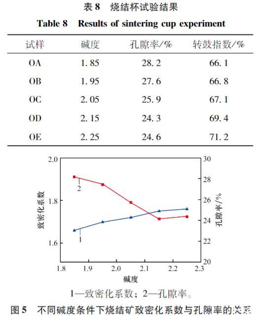 為了探究本試驗中得到的致密化系數(shù)與燒結(jié)礦強度的關(guān)系,通過燒結(jié)杯試驗,研究了堿度為1.85~2.25范圍內(nèi)燒結(jié)礦孔隙率及轉(zhuǎn)鼓指數(shù)的變化,試驗方案如表3所示,通過壓汞儀測量燒結(jié)礦的孔隙率,試驗結(jié)果如表9所示,不同堿度條件下燒結(jié)礦致密化系數(shù)與孔隙率的關(guān)系如圖5所示。