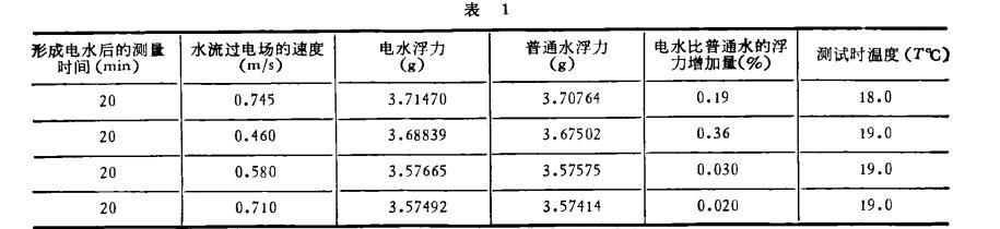 用自制電水器形成電水,用精度為0.1mg的電光天平測定電水和普通水的浮力。實驗用水是長春市自來水和深井水,測試時只要保證水溫和環境溫度穩定,數百次實驗證實,電水浮力比普通水浮力增加,重復性規律較好。現選四組數據列于表1。