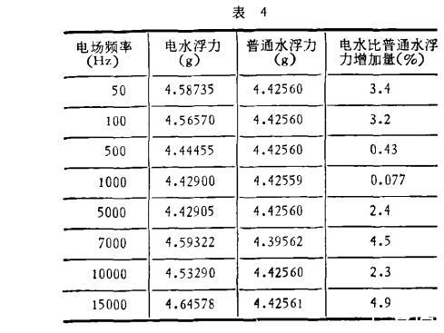 實驗用的振蕩穩壓源是上海華東電子儀器廠制造的,輸出功率75W,該電源的電壓在實驗時保持300V、600V和700V三個數值。改變頻率從0到15kHz,水流過電場的速度為0.16m/s,水溫12.0±0.3℃,用長春市自來水和地下深井水。電水形成后20分鐘開始測浮力。測試時間為1984年10月18日到1984年10月21日,重復性實驗進行六次,曲線都帶有極值。表4是在電壓600V下的一組數據。