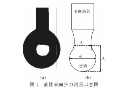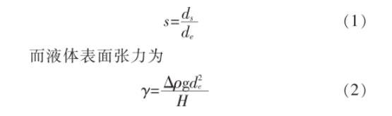 筆者采用液體表面張力的測(cè)量方法為懸滴法,即通過測(cè)量懸掛著的液滴的外形參數(shù)而推算出液體表面張力,如圖1所示。在憎水角測(cè)試儀配套的微量進(jìn)樣器中滴出液滴,拍攝液滴照片,讀取液滴形態(tài)參數(shù)的像素值,根據(jù)測(cè)量滴管的實(shí)際尺寸和像素值,獲得像素值和實(shí)際尺寸的比例,換算實(shí)際液滴的尺寸參數(shù),并根據(jù)公式推算表面張力。