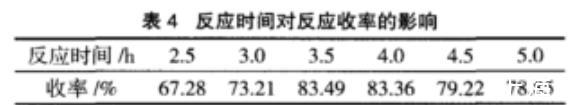 反應時間過短,則反應不完全,過長也無益于反應,因此適當的反應時間對反應收率也很重要。根據同類反應的情況,將反應時間選在2.5~5h。在反應體系pH=10~11、n(天冬氨酸)∶n(十四酰氯)=1.1∶1.0、溫度5℃條件下,考察不同反應時間對反應的影響,其結果如表4所示。由表4可知,反應時間3.5h反應收率達到最佳。