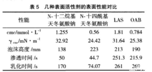 對N-十四酰基天冬氨酸鈉鹽的幾項表面性能進行了測定,并與其他表面活性劑進行了對比,結果見表5。