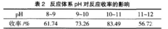 縮合反應需在堿性條件下進行,堿性太弱,不利于反應進行,但堿性太強又會加速酰氯水解,使產品不純,因此必須嚴格控制反應體系的pH。還有一個原因就是當氨基酸的羧基變成鈉鹽后,羧基的化學反應性能即被掩蔽或者說羧基被保護,而氨基的化學反應性能得到加強或說氨基活化,容易和酰基結合。因此體系的pH選取在8~12。在n(天冬氨酸)∶n(十四酰氯)=1.1∶1.0、反應時間3.5h、反應溫度5℃的條件下,考察不同反應體系pH對反應的影響,其結果如表2所示。由表2可知,體系在pH為10~11時收率最高。故選擇pH為10~11。