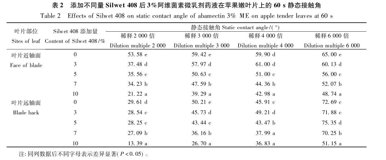 本研究表明,3%阿維菌素微乳劑中添加Silwet 408可顯著降低藥液表面張力及其在蘋果葉片上的接觸角,且表面張力和接觸角的變化與助劑添加量和葉片的狀態相關。因此在實際生產中,應根據害蟲為害的部位及葉片狀態等,有針對性地選擇適宜的表面活性劑及其添加量。