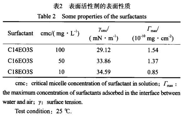 表面活性劑分子的結(jié)構(gòu)特點決定了其在水溶液界面(液-氣)上的吸附特性,其極性基團指向水、非極性基團則指向氣。應(yīng)用Gibbs公式可計算表面活性劑在單位溶液表面的最大飽和吸附量(Γmax),表面活性劑的表面性質(zhì)見表2。由表2可見,C14EO3S,C16EO3S,C18EO3S表面活性劑在蒸餾水中的cmc分別為100,50,10 mg/L,對應(yīng)的γcmc分別為29.12,33.86,34.59 mN/m。由此可見,表面活性劑在蒸餾水中的cmc隨疏水基鏈長的增加而降低。這是因為:一方面,脂肪醇聚氧乙烯醚磺酸鹽表面活性劑中含有親水的EO基團,其分子鏈呈鋸齒蜷曲形態(tài)排列,分子占據(jù)面積較大;另一方面,分子中的疏水基鏈長的增加,導(dǎo)致疏水基團的相互作用增強,對蜷曲的分子起到拉伸作用,同時會降低分子親水頭基面積,在這兩個相反作用中疏水基的相互吸引作用隨著疏水鏈長度的增加而明顯增強,使得表面活性劑分子排列更緊密,易于形成膠束。但cmc對應(yīng)的γcmc則隨疏水基鏈長的增加而略有增加。