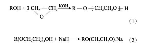 利用表面活性劑進行化學(xué)驅(qū)油可大幅提高原油采收率,主要原理在于表面活性劑能較大程度地降低油水界面張力。脂肪醇醚磺酸鹽表面活性劑為非離子-陰離子復(fù)合型表面活性劑,其分子結(jié)構(gòu)中含有脂肪族碳鏈疏水基,以及氧乙烯基團和磺酸基團兩種親水基,不僅兼具很好的抗溫和抗鹽能力,且表面活性高、配伍性好、生物降解性能好,可用作高礦化度及高溫油藏的化學(xué)驅(qū)油劑,具有廣泛的應(yīng)用前景。國內(nèi)外有關(guān)脂肪醇聚氧乙烯醚磺酸鹽類表面活性劑合成的研究報道較多,但對環(huán)氧乙烷(EO)數(shù)為3的脂肪醇醚磺酸鹽表面活性劑性能的研究較少。