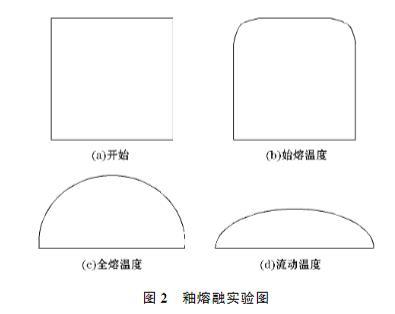 通過(guò)對(duì)釉料熔融實(shí)驗(yàn)的觀察可以看到,隨著溫度升高,低共融物產(chǎn)生,試樣出現(xiàn)液相,逐漸變?yōu)槿垠w。四棱柱試樣最先變形的部位為頂部角點(diǎn)。由于角點(diǎn)是四棱柱曲率最大的部位(7/8的表面與空氣接觸),表面張力最大,表面能高,由表面張力產(chǎn)生的指向熔體內(nèi)部的附加壓力也最大,因此角點(diǎn)最先熔融變圓,此時(shí)試樣所處的溫度(1180℃),稱為釉的始熔溫度,釉層開(kāi)始封閉,如圖2b所示。隨著溫度繼續(xù)升高,四棱柱的棱邊也開(kāi)始熔融變圓,棱邊也是曲率較大的部位(3/4的表面與空氣接觸)。最后,四棱體的各個(gè)平面開(kāi)始熔融變圓(1/2的表面與空氣接觸),整個(gè)試樣由于表面張力的作用變?yōu)榘肭驙睿藭r(shí)的溫度(1260℃)稱為全熔溫度,如圖2c所示,形成平整、光滑的釉面。釉層雖然處于黏性流動(dòng)狀態(tài),但黏度較大不至于流淌,因此接近于釉的成熟溫度。溫度繼續(xù)升高,試樣流散開(kāi)來(lái),高度降至原有高度的1/3時(shí)的溫度(1300℃)稱為流動(dòng)溫度,見(jiàn)圖2d。此時(shí)由于溫度升高,熔體表面張力減小,同時(shí)釉熔體黏度降低,受重力作用熔體會(huì)產(chǎn)生自然流淌,熔體表面由球面變?yōu)闄E球面。