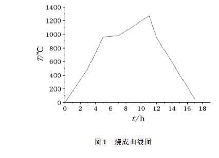 把磨好的釉料制成2cm×2cm×3cm正四棱柱試樣,置于窯門洞口內(nèi),借助于高溫顯微鏡可連續(xù)觀察其在加熱過(guò)程中的全部變化。本次實(shí)驗(yàn)采用還原氣氛進(jìn)行燒制,實(shí)驗(yàn)最高燒成溫度為1270℃,氧化和還原氣氛轉(zhuǎn)換溫度為980℃,圖1為燒成曲線圖。