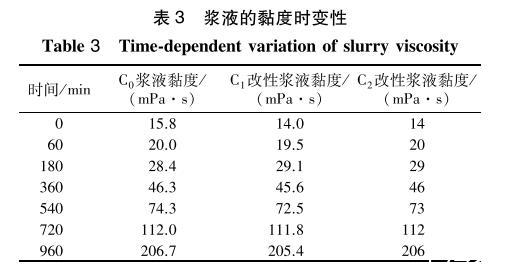 3種漿液在23℃條件下黏度隨時間變化關系見表3。可以看出:3種漿液的黏度均隨時間的增長而逐漸變大,表面活性劑對漿液的初始黏度以及不同時間的黏度影響很小(最大變化≤1.8mPa·s)。說明加入表面活性劑對漿液的黏度變化無影響。