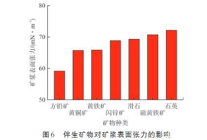 對礦漿濃度為30%的黃銅礦、方鉛礦、滑石、閃鋅礦及石英的礦漿表面張力進(jìn)行了測定。在pH=7、粒度-0.074 mm占比80%的條件下,考察了黃鐵礦與磁黃鐵礦及伴生礦物質(zhì)量比為7∶3時,不同伴生礦物對礦漿表面張力的影響,結(jié)果見圖6。由圖6可知:不同礦物的礦漿表面張力存在差異,具體為石英72.17 mN/m、磁黃鐵礦70.72 mN/m、滑石69.31 mN/m、閃鋅礦68.88 mN/m、黃鐵礦65.89 mN/m、黃銅礦65.72 mN/m、方鉛礦59.14 mN/m。分析結(jié)果表明,方鉛礦的礦漿表面張力最低,而石英的礦漿表面張力與水的表面張力(72.80 mN/m)最為接近。