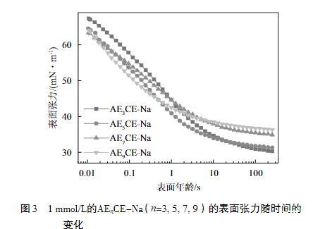 由圖3可以看出,溶液的表面張力都得到了明顯的降低。根據(jù)Rosen理論,表面張力隨時間的變化依次可分為誘導區(qū)、快速下降區(qū)、介平衡區(qū)和平衡區(qū)4個區(qū)域。但在系列AEnCE-Na樣品中,都沒有檢測到誘導區(qū),說明樣品的擴散速率都很快,已經(jīng)超過了儀器的檢測上線(10 ms)。各個樣品在檢測范圍內(nèi)最終的表面張力從大到小依次為:AE9CE-Na>AE7CE-Na>AE5CE-Na>AE3CE-Na,該結(jié)果與平衡表面張力的變化趨勢相一致。