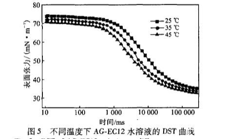 由圖5可知,當溫度升高,DST下降的速率明顯加快。這是因為分子的不規則運動更加激烈,使得分子間的引力減小。表面張力越早開始下降,在各個階段的表面張力值就越低。在45℃下開始測量時,表面張力已經降到了70mN/m左右,這也許是由于溫度升高降低了純溶劑水的表面張力。升高溫度,表面張力下降的更快,更易達到第四個階段平衡狀態。這說明了高溫下其動態表面活性更好??赡苁怯捎诒砻婊罨茉诟邷貢r更低,使得AG.EC分子更易在溶液表面吸附。
