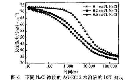 平衡張力研究表明,三種烷基糖苷檸檬酸單酯鹽在其各自的水溶液中均具有表面活性。動態表面張力研究表明,同摩爾濃度AG—EC08、AG.ECIO和AG—EC12水溶液的動態表面活性在達到一定時間后隨表面活性劑分子的疏水鏈增長而不斷增大;AG—EC溶液的濃度越高,其動態表面活性越好,DST越快平衡,DST曲線越低。而當溫度升高,其DST明顯下降;無機電解質NaC1對其DST的影響也較明顯,隨著NaC1濃度增大,其DST曲線越低。