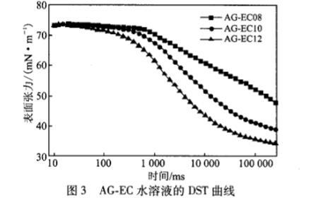 由圖3可知,對于不同鏈長的AG.EC水溶液,其DST曲線都是微微下降一快速下降一緩慢平衡的過程。另外在疏水鏈變長的同時,DST曲線的誘導期時間縮短,DST下降趨勢增加,介平衡狀態表面張力值越低。這是由于疏水烷基鏈增長使得表面活性劑的疏水性增強,更容易吸附到溶液的表面。