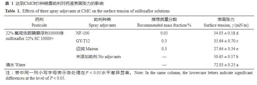 當溶液中的表面活性物質(zhì)的質(zhì)量濃度達到其CMC時,液體具有良好的吸附和潤濕性,因此確定助劑的最低施用濃度以大于等于其CMC為依據(jù)。3種噴霧助劑的CMC測定結(jié)果見圖1。NF-100、GY-T12和邁潤3種噴霧助劑的CMC的對數(shù)值分別為2.40、3.43和3.46,得到其CMC分別為250、2708和2877 mg/L,其中糖基類表面活性劑NF-100具有更低的CMC,比另外兩種低一個數(shù)量級。根據(jù)助劑添加量應適當大于其CMC的原則,考慮量取方便,將NF-100的添加量確定為500 mg/L、折算為質(zhì)量分數(shù)0.05%,將GY-T12和邁潤的添加量確定為3000 mg/L、折算為質(zhì)量分數(shù)0.3%。在此添加量下,測定了3種噴霧助劑對氟啶蟲胺腈藥液表面張力的影響。結(jié)果(表1)表明,添加NF-100、GY-T12和邁潤3種助劑后,氟啶蟲胺腈藥液的表面張力顯著降低,由未添加助劑時的50.65 mN/m分別降低至34.03、35.64和27.64 mN/m,其中邁潤對藥液表面張力的降低效果最顯著,3種助劑之間均存在顯著差異(P<0.05)。