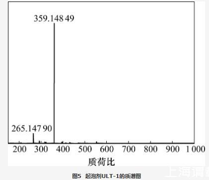 利用電噴霧質譜法表征起泡劑ULT-1的分子結構,結果如圖5所示。從圖5可知:起泡劑ULT-1的相對分子質量為764,脫去2個Na+后的陰離子碎片相對分子質量為718,帶2個負電荷,質荷比為359,與質譜圖上359.148 49的峰一致,265.147 90的峰為雜質十二烷基硫酸鈉脫去1個Na+后的陰離子碎片形成的,表明成功合成了所設計的起泡劑。