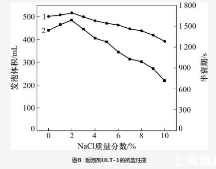 利用抗NaCl污染的能力評價質量分數為0.2%起泡劑ULT-1水溶液的抗鹽性能。在室溫下,稱取0.2 g起泡劑ULT-1于攪拌杯中,加入100 mL蒸餾水,置于攪拌器之上,以轉速11 000 r/min攪拌1 min。直接加入一定量的NaCl,以轉速11 000 r/min攪拌1 min,測量發泡體積和半衰期。通過改變NaCl的質量分數測量起泡性能,結果如圖8所示。從圖8可知:當NaCl質量分數在2%以內時,發泡體積和半衰期緩慢增大,當NaCl質量分數繼續增大時,發泡體積和半衰期緩慢降低;當NaCl質量分數達10%時,發泡體積和半衰期仍能保持較高水平,表明研制的新型起泡劑ULT-1具有較好的抗鹽性能。