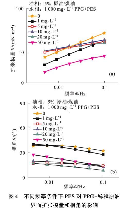圖4不同頻率條件下PES對PPG-稀釋原油界面擴張模量和相角的影響