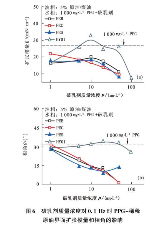 圖6破乳劑質量濃度對0.1 Hz時PPG-稀釋原油界面擴張模量和相角的影響