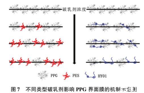 圖7不同類型破乳劑影響PPG界面膜的機制示意圖