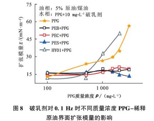 圖8破乳劑對0.1 Hz時不同質量濃度PPG-稀釋原油界面擴張模量的影響