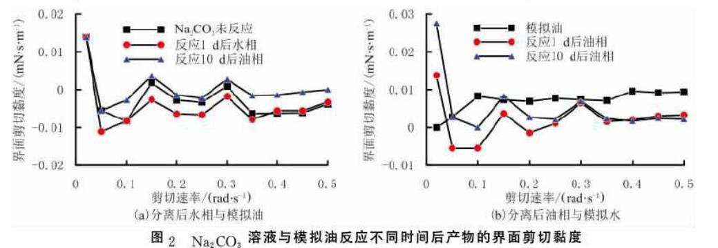 在Na2CO3溶液與模擬油反應(yīng)1d和10d后,分離得到的水相與模擬油及油相與模擬水的界面剪切黏度隨剪切速率變化關(guān)系見圖2.由圖2可以看出,Na2CO3溶液與模擬油反應(yīng)1d及10d后,分離得到的水相與模擬油的界面剪切黏度,與未反應(yīng)Na2CO3溶液與模擬油的界面剪切黏度相比變化不大;模擬油與Na2CO3溶液反應(yīng)1d及10d后,分離得到的油相與模擬水的界面剪切黏度與模擬油與模擬水間的界面剪切黏度相比變化不大,表明Na2CO3溶液與模擬油反應(yīng)后分離出的水相和油相對油水界面剪切黏度影響不大。原因是模擬油中的有機酸組分與Na2CO3溶液反應(yīng)所生成的,無論是水溶性還是油溶性的界面活性物質(zhì)均較少,在油水界面處的吸附不足以引起油水界面剪切黏度的變化。