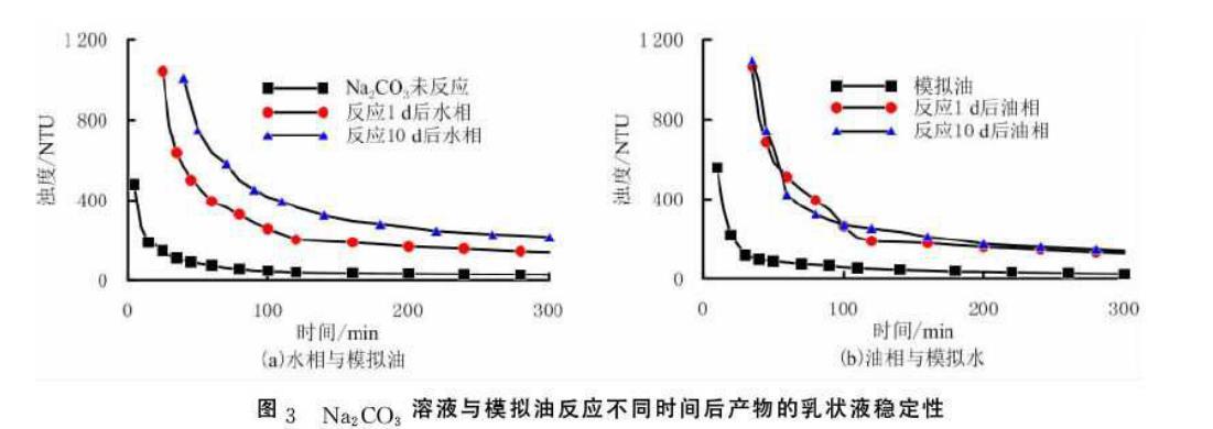 (3)與Na2CO3溶液與模擬油乳化所形成的乳狀液相比,Na2CO3溶液與模擬油反應(yīng)后的水相與模擬油形成的乳狀液的穩(wěn)定性增強。與模擬油與模擬水乳化所形成的乳狀液相比,Na2CO3溶液與模擬油反應(yīng)后的油相與模擬水形成的乳狀液的穩(wěn)定性增強。
