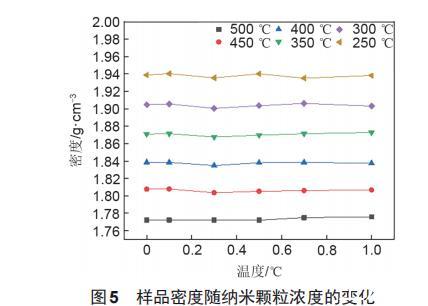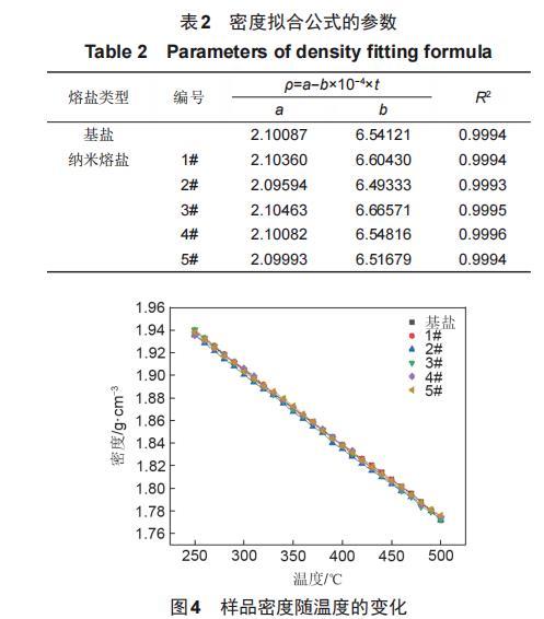 研究表明,在solar salt中加入SiO_2納米顆粒后,熔點會有一定程度的下降,分解溫度會有一定程度的提高。并且solar salt的熔點為218.2℃,所以當(dāng)熔鹽加熱到250℃時,已經(jīng)完全熔化;當(dāng)熔鹽溫度超過600℃時,熔鹽會開始分解。溫度較高和溫度較低都會對實驗測量的數(shù)據(jù)產(chǎn)生影響,造成較大的實驗誤差。因此基鹽及納米熔鹽密度實驗數(shù)據(jù)測定范圍為260~500℃。