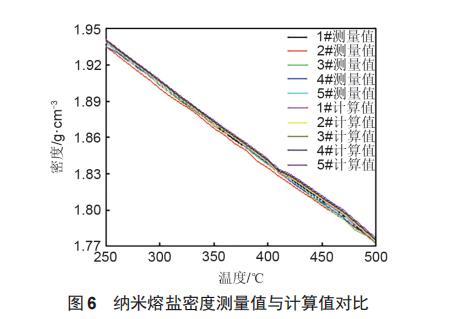 根據(jù)混合物密度計算公式對納米熔鹽的密度進行計算后,與實驗測量得到的密度進行對比。