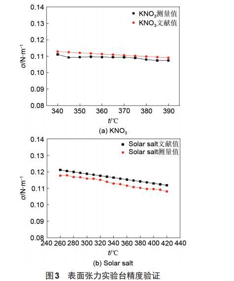 本實驗先對NaNO3的表面張力進行測量,得到儀器系數(shù)C。由式(4)可知,儀器系數(shù)C與溫度無關(guān),對NaNO3在5個溫度工況點下的表面張力進行測量,并且每個溫度工況點采集3次測實驗數(shù)據(jù),通過最終的計算得到本實驗臺的儀器系數(shù)C=0.00053。對KNO和solar salt的表面張力進行測量后,與文獻值進行對比,如圖3所示。