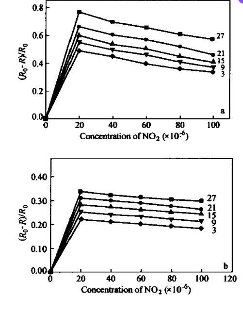 LB膜越薄,與氣體的接觸越充分,被氧化的程度也越高,因而對氣體的響應(yīng)也就越快。同層的PAN/NMP LB膜較PAN-AA/NMP LB膜具有更快的響應(yīng)。3層聚苯胺LB膜對相對百分比為20×10??NO?的響應(yīng)時間為10 s,但是當(dāng)層數(shù)增加到27層時,響應(yīng)時間就上升到90 s。而對于27層的聚苯胺與乙酸的混合LB膜,響應(yīng)時間就更長,接近3 min。另一方面,響應(yīng)時間還隨NO?氣體濃度的增加而增長。圖5反映了15層聚苯胺LB膜的響應(yīng)時間與氣體濃度變化之間的關(guān)系。在相同氣體濃度下,PAN/NMP LB膜較PAN-AA/NMP LB膜具有更快的響應(yīng)和更好的靈敏度。PAN/NMP LB膜對相對百分比為20×10??NO?的響應(yīng)時間為30 s,而PAN-AA/NMP LB膜則為50 s。當(dāng)氣體濃度增大到相對百分比為100×10??時,響應(yīng)時間分別變化到150 s和180 s。