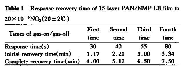 在恢復(fù)的初期,吸附在敏感膜表面上的NO?氣體分子將發(fā)生較快的脫附;而在隨后直至完全恢復(fù)的這段較長的時間里,擴散進敏感膜體內(nèi)的NO?分子將發(fā)生非常復(fù)雜的脫附過程:在LB膜和NO?氣體之間的吸附與脫附作用是一個動態(tài)過程,脫附的NO?分子又有可能吸附于LB膜表面或擴散進膜內(nèi)部,尤其隨著通氣與排氣的次數(shù)增加,這種情況就更加復(fù)雜。