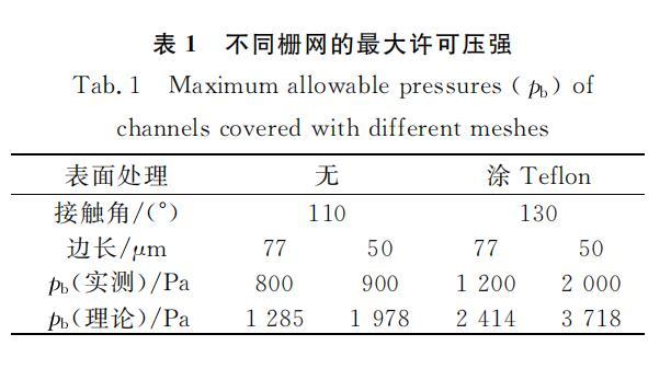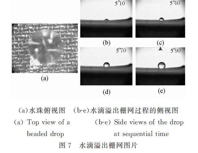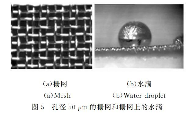 所用柵網(wǎng)為不銹鋼濾網(wǎng),有一定剛度,管道較窄,可以保證管道頂面平整。柵網(wǎng)孔為方形,使用的兩種柵網(wǎng)孔邊長(zhǎng)分別為50mu m和77mu m。部分柵網(wǎng)涂覆Teflon(AF2400,DuPont),部分沒有做處理。圖5所示為未經(jīng)處理的柵網(wǎng)和柵網(wǎng)上的水滴。