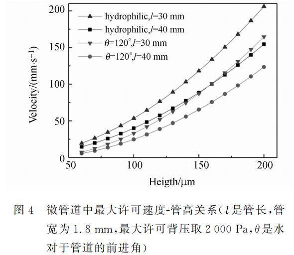 利用約束條件式(5)或(6),可以得到管道中液體的最大許可速度。為了簡(jiǎn)化分析,假設(shè)出口處壓強(qiáng)為0。計(jì)算中假設(shè)管道各個(gè)壁面性質(zhì)相同。利用式(4)計(jì)算壓降時(shí)要求流動(dòng)定常,當(dāng)液體流過干燥管道時(shí)并不是定常流動(dòng),利用式(4)作近似計(jì)算。最大許可速度與管道高度的關(guān)系如圖4所示,包括疏水管道和親水管道兩種情況。可以看出,管高一定時(shí),在親水管道中最大許可速度較大,且最大許可速度隨管高增加而增大,隨管長(zhǎng)的增加而減小。