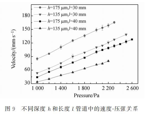 管道中充滿水時(shí)的速度-壓強(qiáng)關(guān)系如圖9所示。管道截面尺寸主要通過等效水力直徑影響摩擦阻力系數(shù)。由于管道深度遠(yuǎn)小于寬度,管道的等效水力直徑取決于管道深度,故這里固定管道寬度而對(duì)不同深度的管道進(jìn)行比較分析。由圖9可知,壓強(qiáng)一定,管道越深,長(zhǎng)度越短,對(duì)應(yīng)的流速越大。圖中每條曲線的最大壓強(qiáng)就是測(cè)量中每個(gè)管道的最大許可壓強(qiáng),這些壓強(qiáng)值都大于表1中的最大許可壓強(qiáng)實(shí)測(cè)值。這一方面是由于柵網(wǎng)孔徑分布不均勻,另一方面是由于沿程水頭損失作用,管道中壓強(qiáng)分布沿流動(dòng)方向減小,導(dǎo)致最大壓強(qiáng)沒有出現(xiàn)在孔徑最大的地方,從而得到的壓強(qiáng)大于靜止?fàn)顟B(tài)下測(cè)得的最大許可壓強(qiáng)。