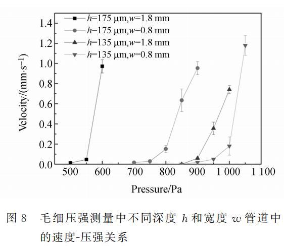 PDMS微管道采用軟光刻工藝制作。PDMS結(jié)構(gòu)層從模具揭下后,倒過來粘接在基底上,管道裸露朝上,形成開放管道。然后用壓敏膠(ARclad IS-7876,Adhesives Research.Inc.)將棚網(wǎng)粘接到開放管道上。制作的微管道寬分別為0.8~mm和1.8~mm,深75mu m和115mu m,長(zhǎng)3cm和4cm。壓敏膠厚約60mu m,最終得到的開放管道高度約135μm和175μm。