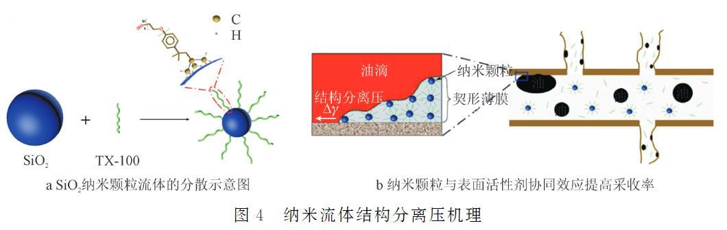 WasanD等提出的“結(jié)構(gòu)分離壓”理論,解釋了納米流體在油-固界面時(shí)這種壓力作用將油膜或油滴從巖石表面分離的過程。通過進(jìn)一步的研究發(fā)現(xiàn),這種結(jié)構(gòu)分離壓力的大小和速度受到納米顆粒濃度和液滴體積的影響。ZHAO等以非離子表面活性劑(TX-100)作為分散劑和增效劑,將SiO2納米顆粒分散在水中形成SiO2納米流體(如圖4a所示),并對(duì)SiO2納米流體剝離固體表面油滴的能力進(jìn)行了探究。SiO2納米流體和表面活性劑(TX-100)均具有將油滴從巖石表面脫離的能力。與表面活性劑(TX-100)相比,當(dāng)添加SiO2納米顆粒時(shí),納米流體可以在油/固體/納米流體三相接觸區(qū)形成薄膜從而產(chǎn)生結(jié)構(gòu)分離壓,將油滴從巖石表面剝離。由于表面活性劑天然剝離油滴的能力和SiO2納米顆粒的結(jié)構(gòu)分離壓力機(jī)理(如圖4b所示),SiO2納米流體具有優(yōu)秀的滲吸提高采收率能力。