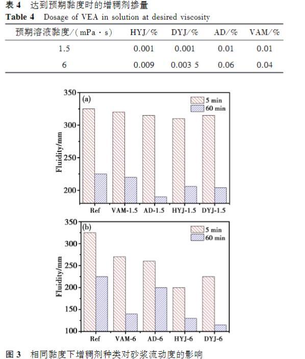 增稠劑溶液的黏度越高,砂漿的流動(dòng)度越低。在較低黏度下,四種增稠劑對(duì)砂漿初始流動(dòng)度的影響接近,60min時(shí),AD的經(jīng)時(shí)流動(dòng)度最低,VAM流動(dòng)度相對(duì)于基準(zhǔn)砂漿略微下降;然而當(dāng)溶液黏度提高至6mPa·s時(shí),摻入HYJ和DYJ的砂漿流動(dòng)度顯著低于AD和VAM,60min后的損失也更大,AD的經(jīng)時(shí)流動(dòng)度略低于基準(zhǔn)砂漿。