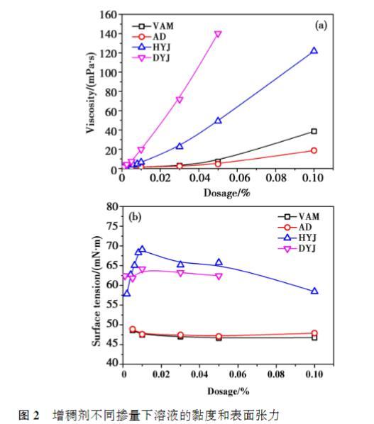相同摻量下,DYJ的黏度最高,其次是HYJ,VAM和AD黏度在低摻量下接近,摻量達(dá)到0.10%之后,VAM黏度高于AD;VAM和AD的黏度隨著摻量的提高緩慢增大,而HYJ和DYJ溶液的黏度隨摻量的提高迅速提高,尤其是DYJ的增長(zhǎng)幅度更為顯著。總體來看,增稠劑分子量越大,相同摻量時(shí)溶液的黏度越高。從表面張力的結(jié)果來看,相同摻量下,HYJ溶液的表面張力最高,其次是DYJ,VAM和AD的表面張力顯著低于其他兩種增稠劑,且AD略微高于VAM.