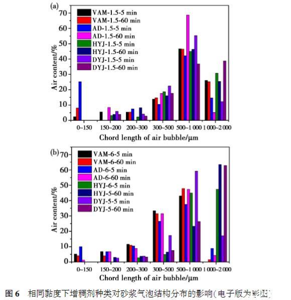 氣泡結(jié)構(gòu)測(cè)試表明,砂漿黏度越高,氣泡結(jié)構(gòu)集中于較大尺寸范圍內(nèi)。隨著時(shí)間推移,高黏度體系下,500——1000μm的氣泡含量顯著下降,而1000——2000μm的氣泡含量則顯著提高;低黏度體系下,300——500μm的氣泡含量有所增大。