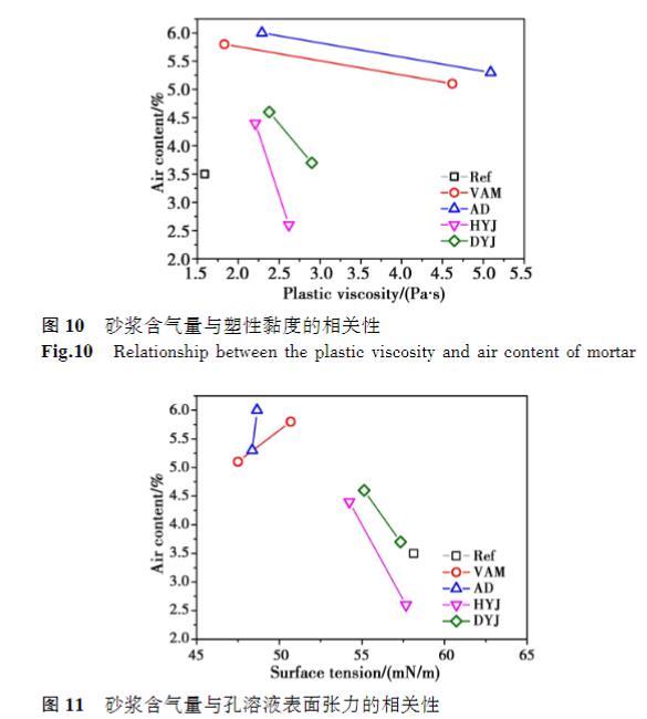當(dāng)溶液黏度為1.5mPa·s時(shí),VAM和AD的摻入使砂漿初始含氣量相對(duì)于基準(zhǔn)砂漿增大66%和71%,而HYJ和DYJ僅使初始含氣量提高26%和31%;當(dāng)溶液黏度為6mPa·s時(shí),VAM和AD的摻入使砂漿初始含氣量相對(duì)于基準(zhǔn)砂漿增大46%和51%,而DYJ僅使初始含氣量提高6%,HYJ則降低含氣量26%.