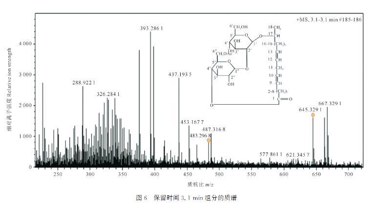 保留時(shí)間為3.1 min時(shí)色譜峰豐度最高。對(duì)該物質(zhì)進(jìn)行詳細(xì)分析,質(zhì)荷比(m/z)645.32的碎片為單乙酰基取代的內(nèi)酯型槐糖脂的分子離子峰,m/z 667.32為[M+Na]+峰,m/z 483.29為[M+H-C8H12O6]+峰,其中C8H12O6為乙酰基取代糖環(huán)。上述分析表明此物質(zhì)為內(nèi)酯型槐糖脂,具體名稱為:17-L-[(2'-O-β-D-吡喃葡萄糖基-β-D-吡喃葡萄糖基)-O-]十八二烯酸-1',4″-內(nèi)酯-6″乙酸酯。