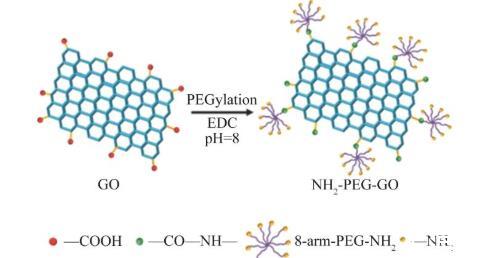 NH2-PEG-GO的制備方法:使用8-arm-PEG-NH2對GO表面進行修飾(圖1)。取80 mL上述細(xì)胞破碎機處理后的GO溶液,加入16 mL質(zhì)量濃度為2 mg/mL EDC來活化GO表面羧基,然后將混合溶液在功率為570 W條件下超聲30 min(開1.5 s,關(guān)1 s),待分散均勻后,再用5%NaOH溶液來調(diào)節(jié)溶液酸堿性(pH=8),隨后將240 mg 8-arm-PEG-NH2加入,超聲反應(yīng)30 min后,再常溫攪拌反應(yīng)12 h,離心水洗后得到氨基修飾的GO,于室溫真空冷凍干燥2 d后,得到最終產(chǎn)物,將產(chǎn)物研磨備用。