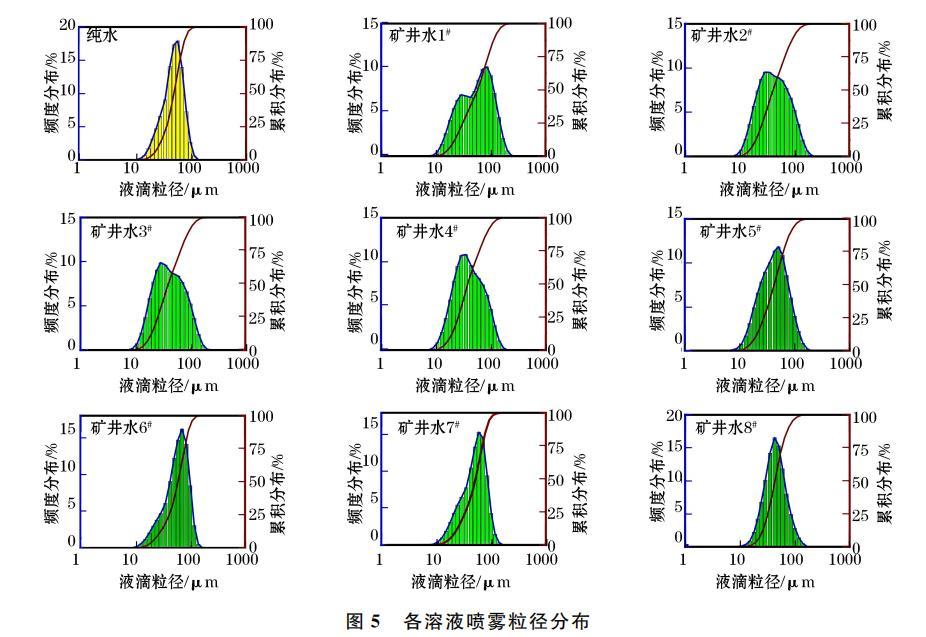 由圖4可知,純水、礦井水1#至4#、礦井水5#至8#表面張力平均值分別為57.73 mN/m、74.41 mN/m、66.03mN/m,純水表面張力明顯小于礦井水,隨著礦井水中Na+、K+數(shù)目減少,其表面張力顯著減弱。這是由于礦井水中Na+、K+離子濃度減小,靜電力吸附有效范圍擴(kuò)大,吸附作用隨之增強(qiáng),直至界面對(duì)離子的吸附作用逐漸大于排斥作用,因此表面張力呈現(xiàn)減小趨勢(shì)。由此可知,低離子濃度條件下,礦井水表面張力與其Na+、K+離子濃度呈正相關(guān)。在相同壓力條件下,表面張力決定霧滴粒徑分布,因此,純水噴霧霧化特性略優(yōu)于礦井水。綜上,礦井水中Na+、K+等離子濃度通過(guò)改變其表面張力間接影響噴霧霧化特性。針對(duì)煤礦井下粉塵治理,可將降塵用水進(jìn)行軟化除鹽處理后應(yīng)用于噴霧降塵,以期降低其表面張力,優(yōu)化噴霧霧化特性。
